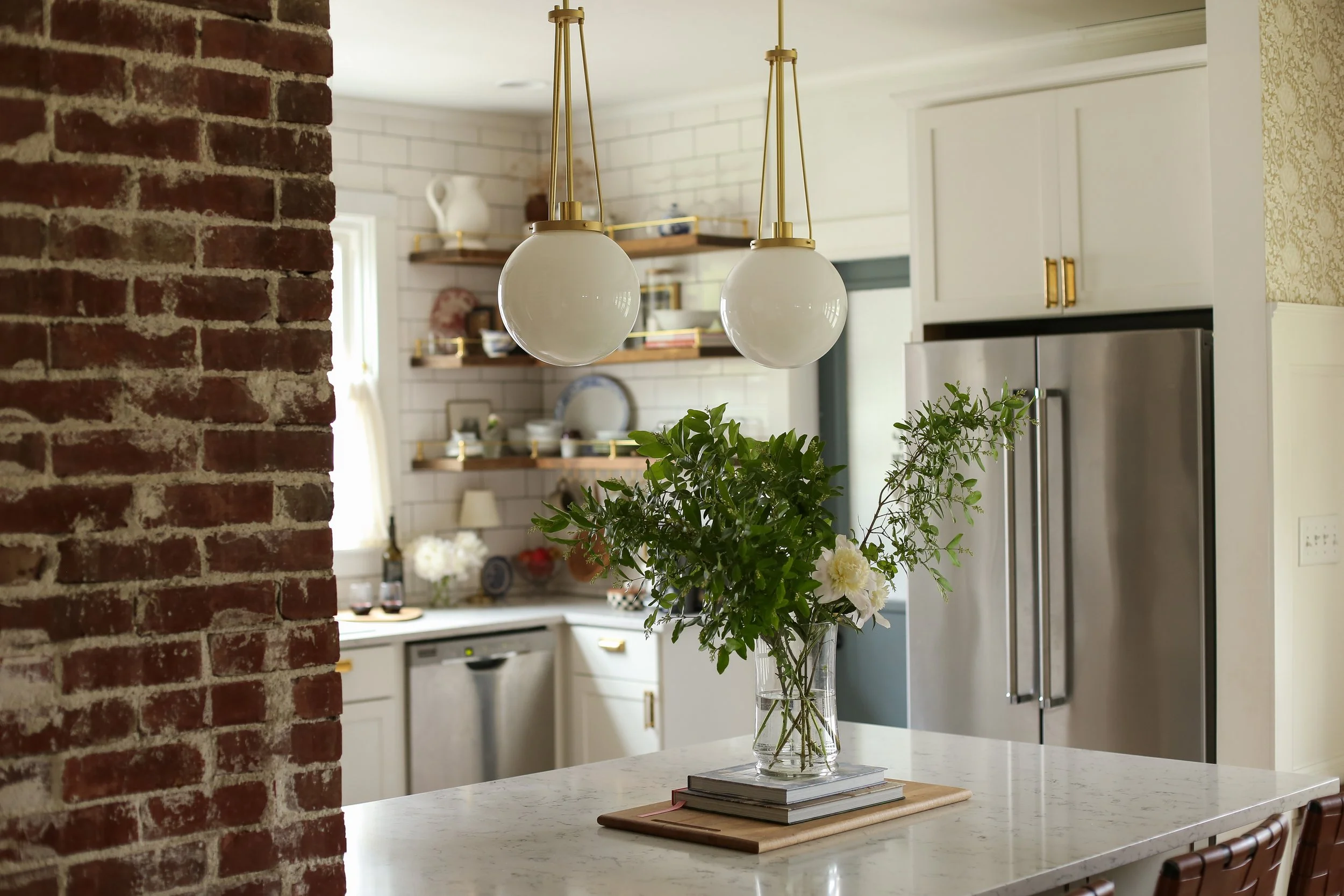 Warm heritage-inspired kitchen featuring Rejuvenation lighting and hardware