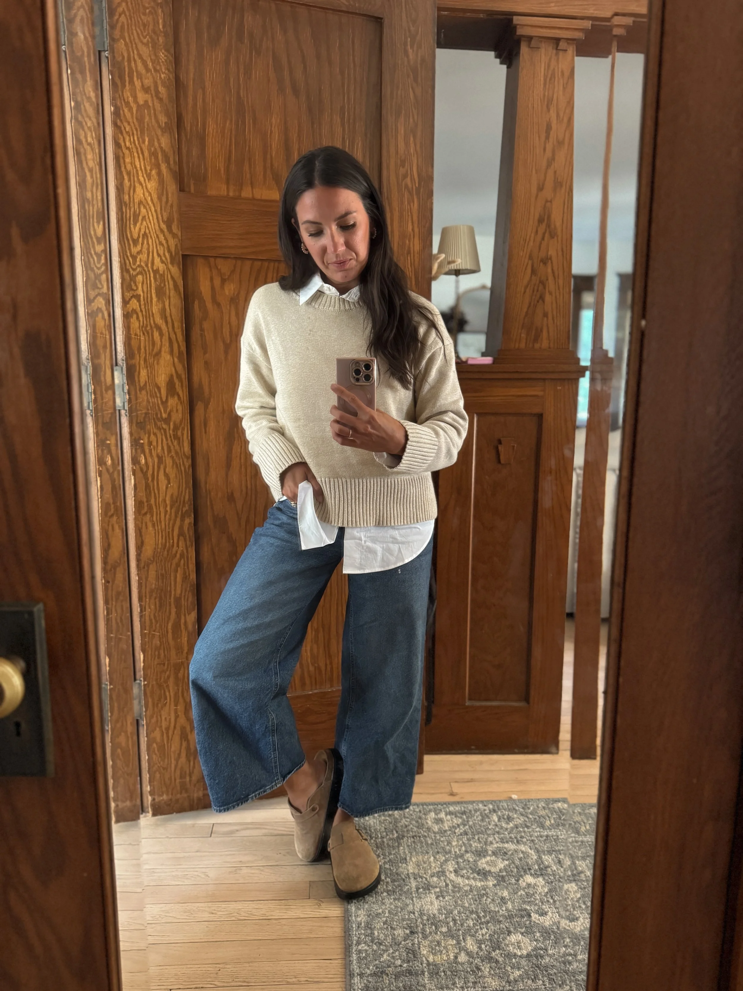 When you want casual but still chic, this combo always delivers → wide-leg denim, a soft cream sweater layered over a crisp white shirt, and classic clogs. It’s the kind of look that feels effortless yet pulled together, perfect for busy days when you don’t want to overthink but still want to feel polished. The balance of relaxed denim with timeless layers makes it both wearable and versatile—easy enough for everyday errands, but chic enough to carry into a dinner out or weekend plans. Simple, timeless, and a formula I’ll always come back to.