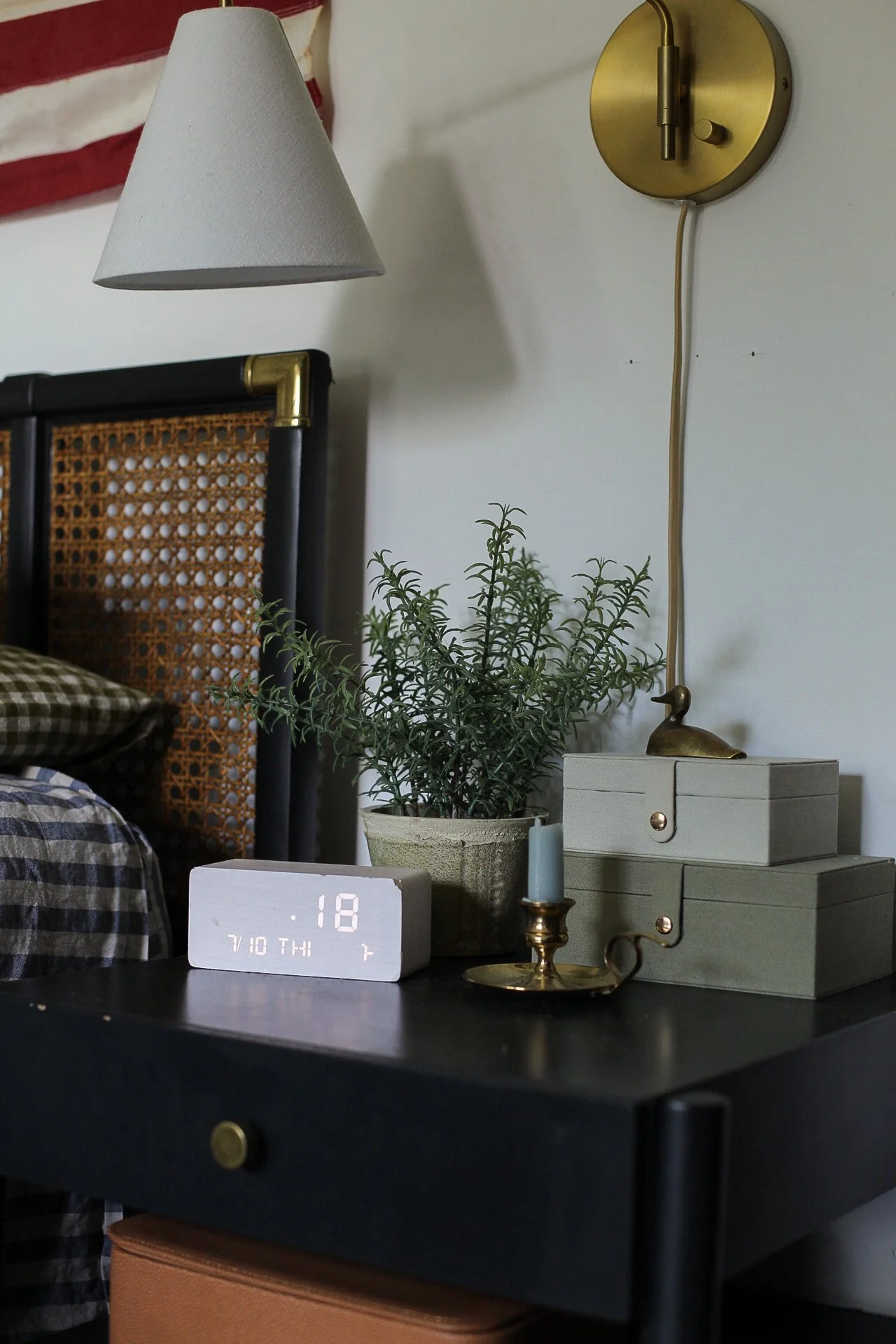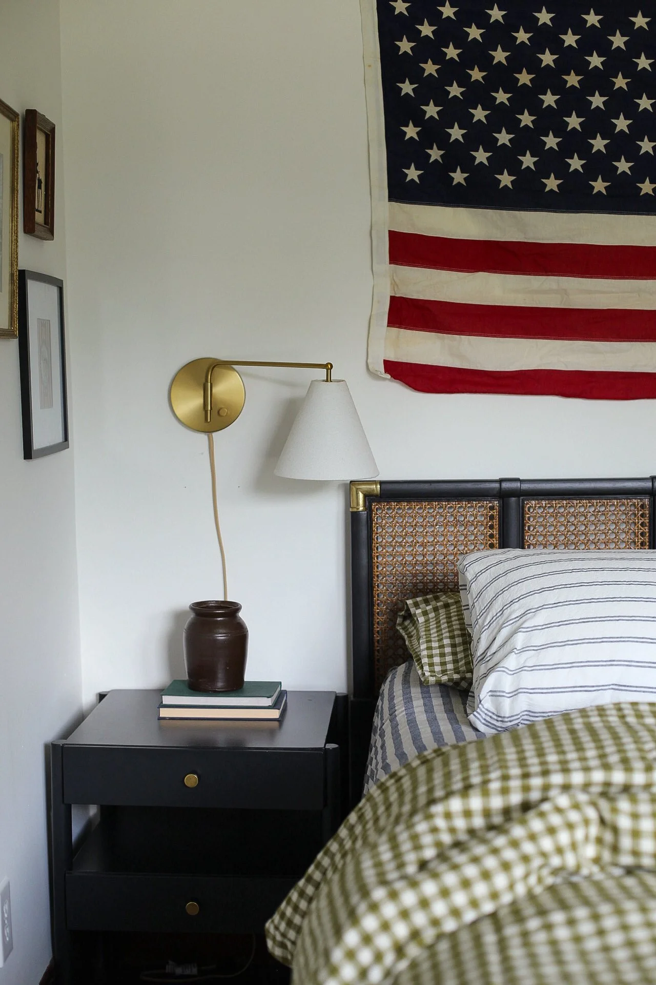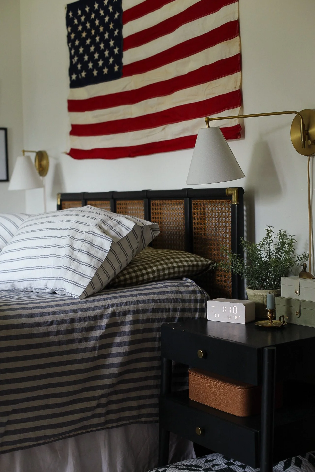 Black Framed Wicker Headboard | Nightstand (actual item) | Vintage Dresser | Ottomans (look a likes)