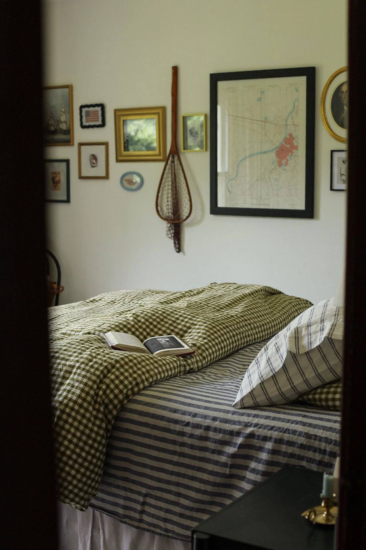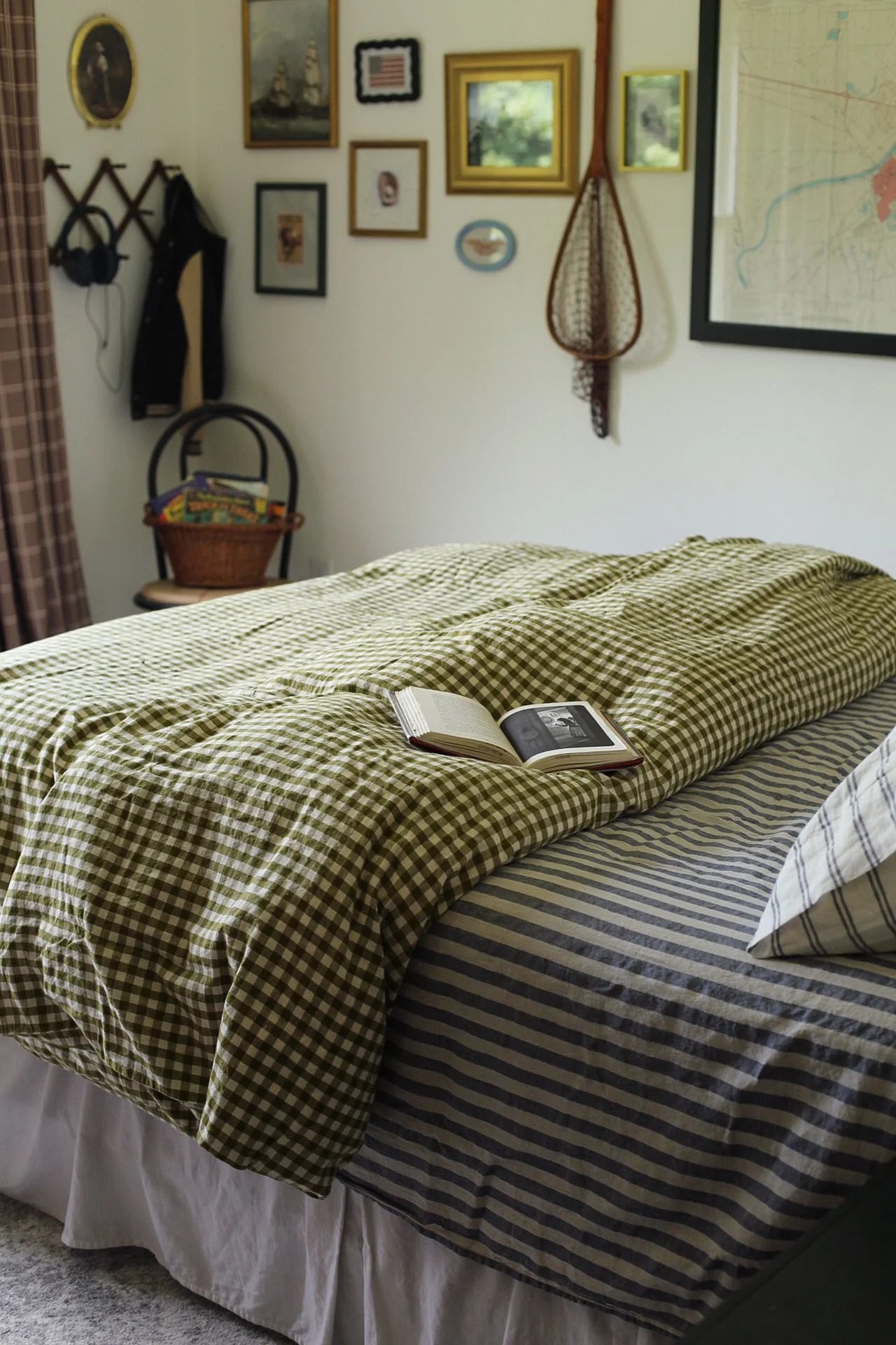 Forest Green Gingham Duvet Cover | Striped Blue Linen Top Sheet | Striped Blue Linen Fitted Sheet | White & Blue Linen Striped Pillowcase