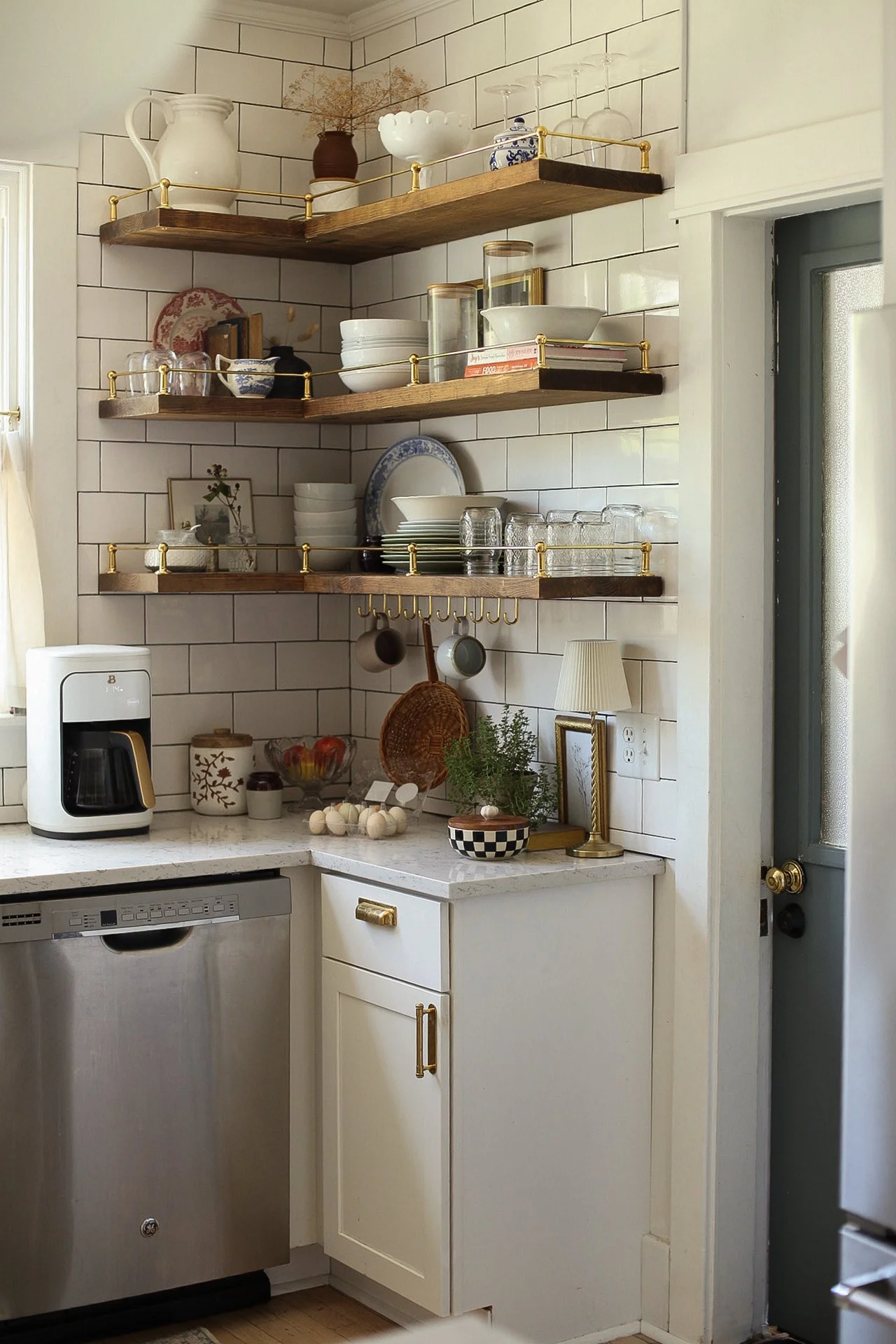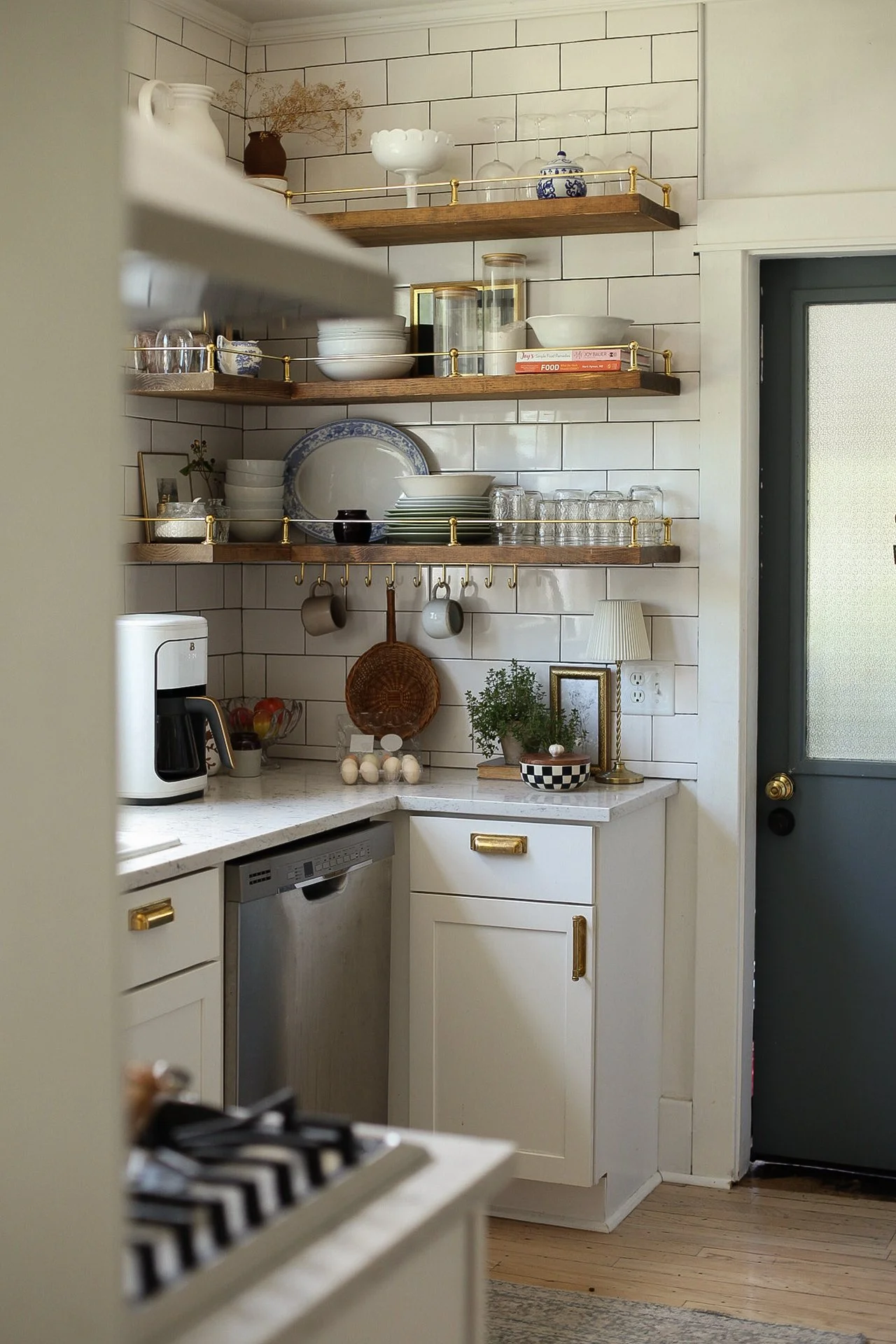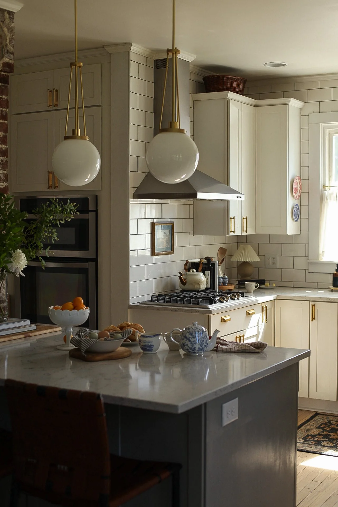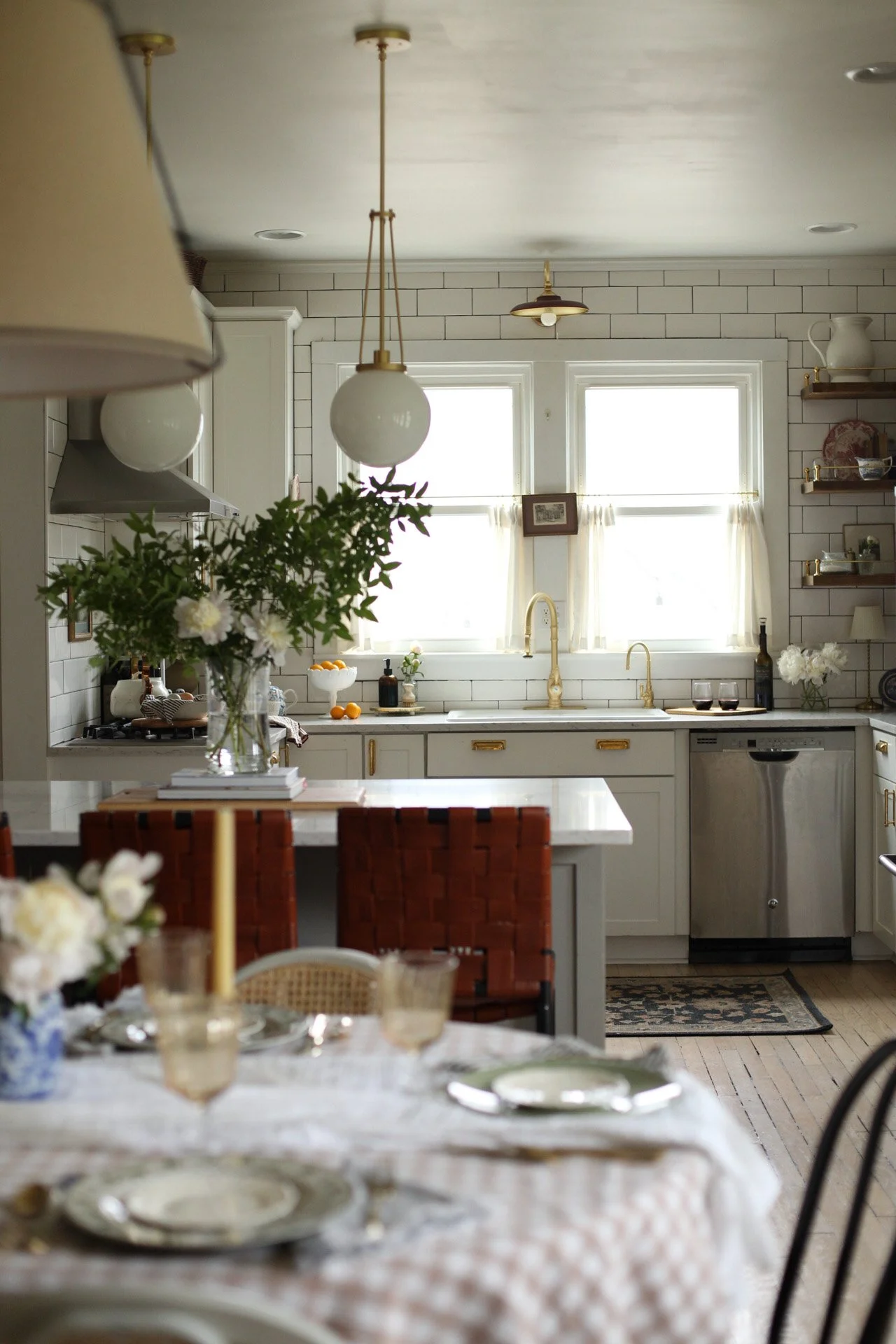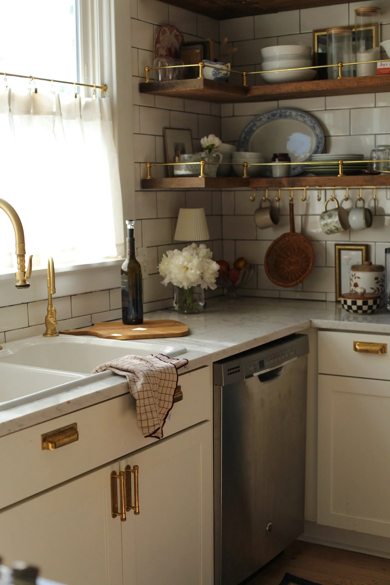 Our kitchen may be just 10x10, but it proves that small spaces can be both beautiful and hardworking. Designed with intention, every detail—from the layered lighting and unlacquered brass hardware to the gallery rail and vintage-inspired fixtures—was chosen to maximize function without sacrificing character. The compact layout makes gathering, cooking, and everyday living feel warm and connected, turning this modest kitchen into the true heart of our 1920s Craftsman home.