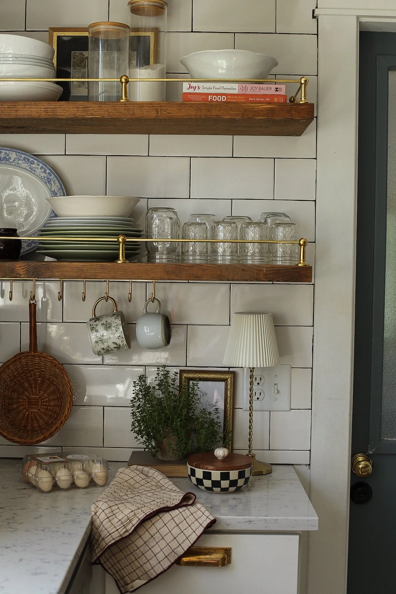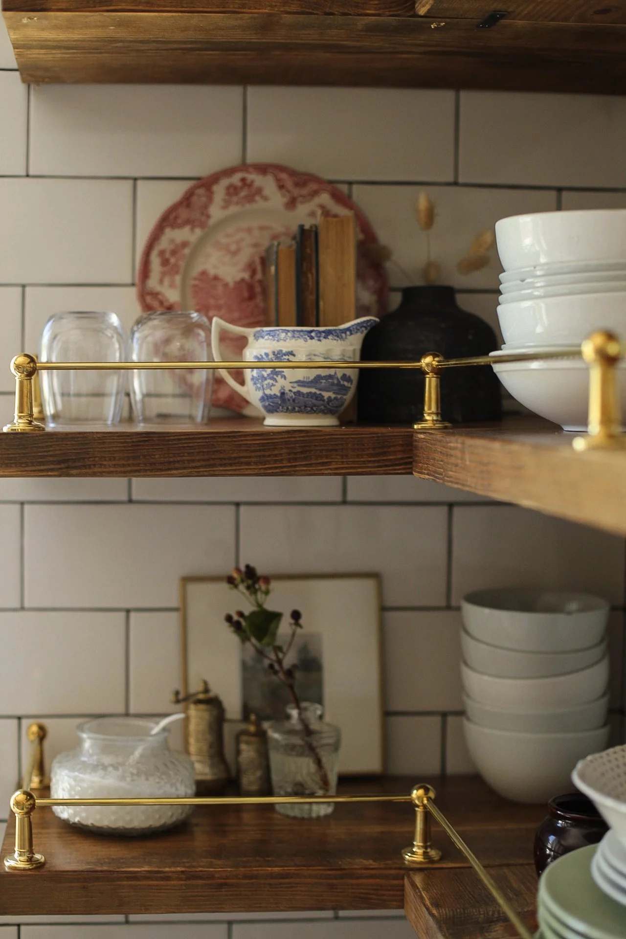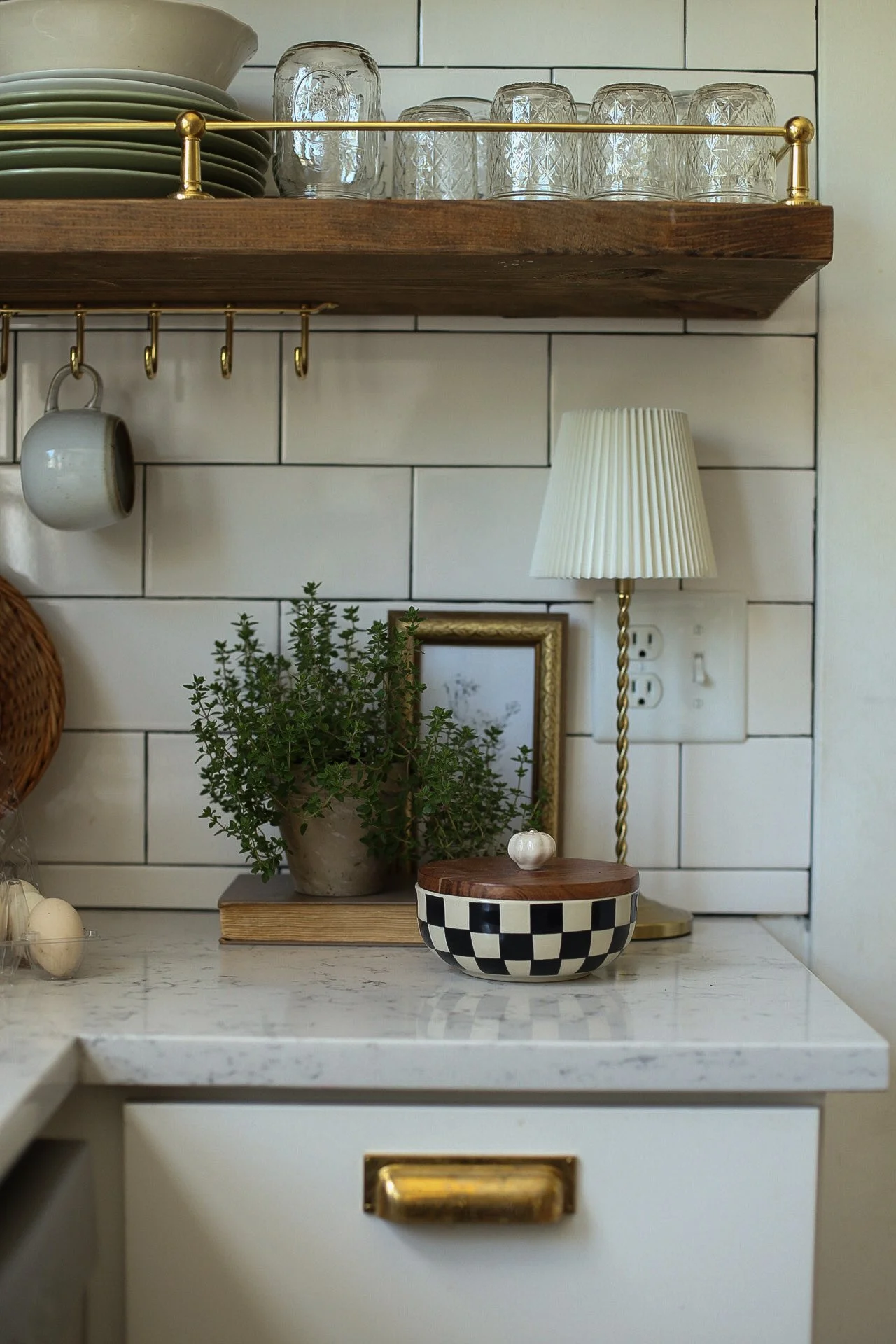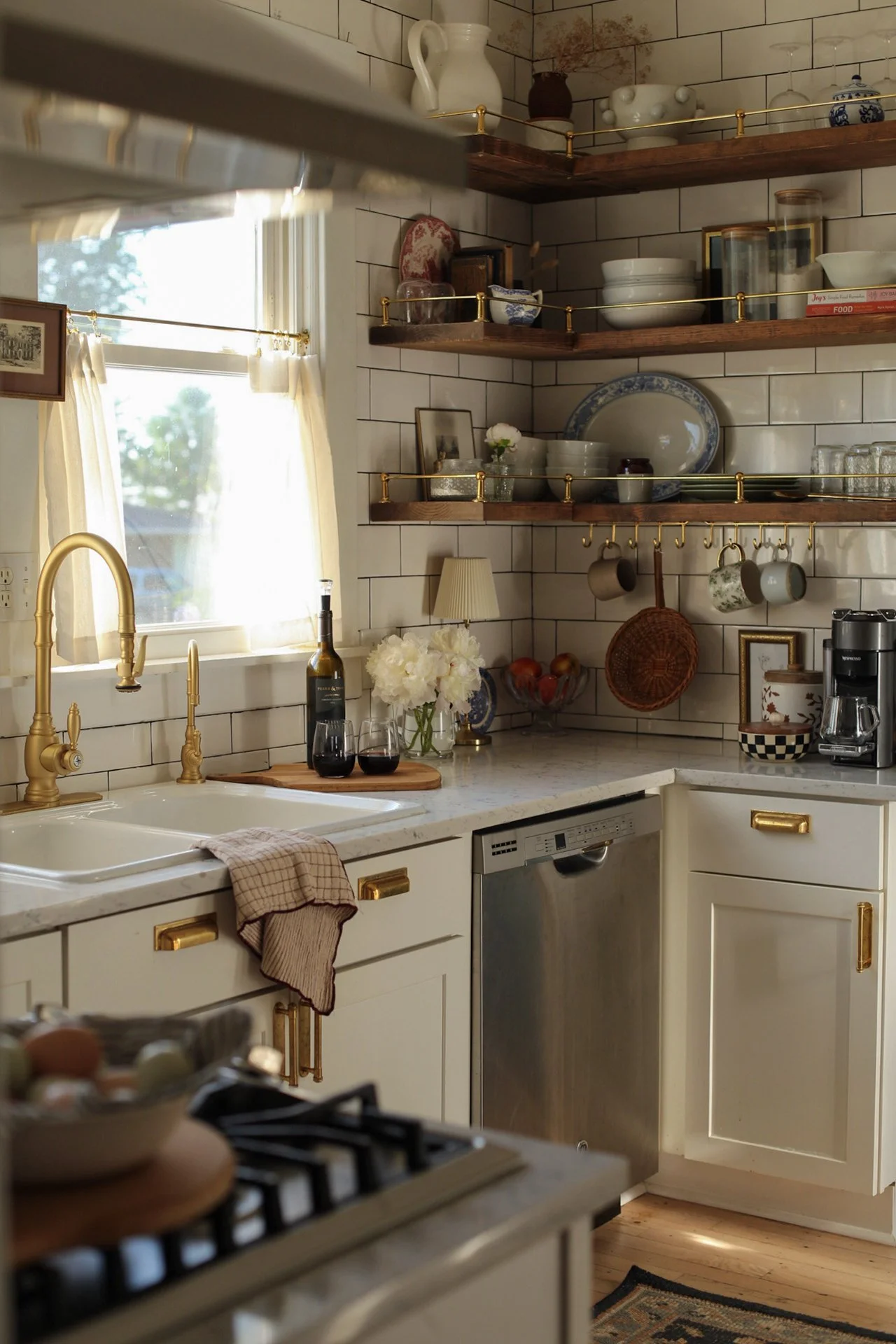 Our kitchen may be just 10x10, but it proves that small spaces can be both beautiful and hardworking. Designed with intention, every detail—from the layered lighting and unlacquered brass hardware to the gallery rail and vintage-inspired fixtures—was chosen to maximize function without sacrificing character. The compact layout makes gathering, cooking, and everyday living feel warm and connected, turning this modest kitchen into the true heart of our 1920s Craftsman home.