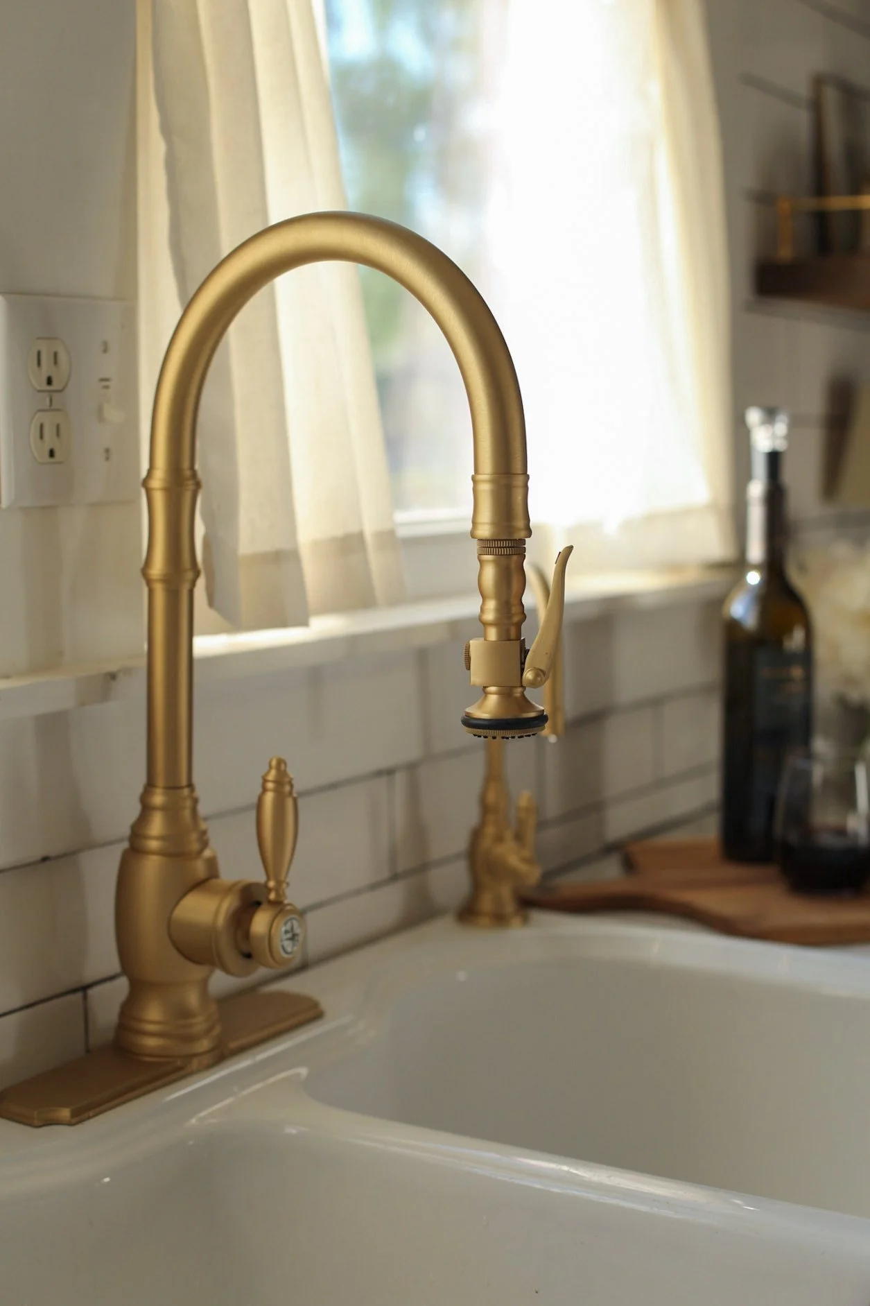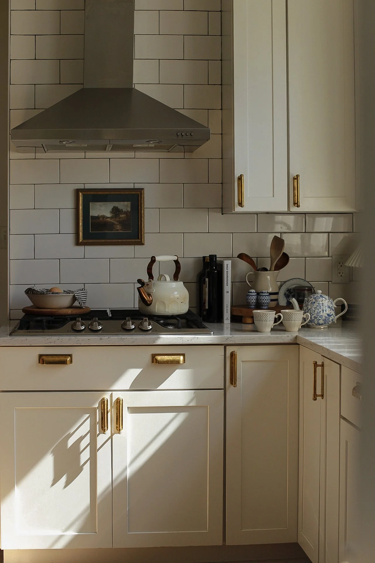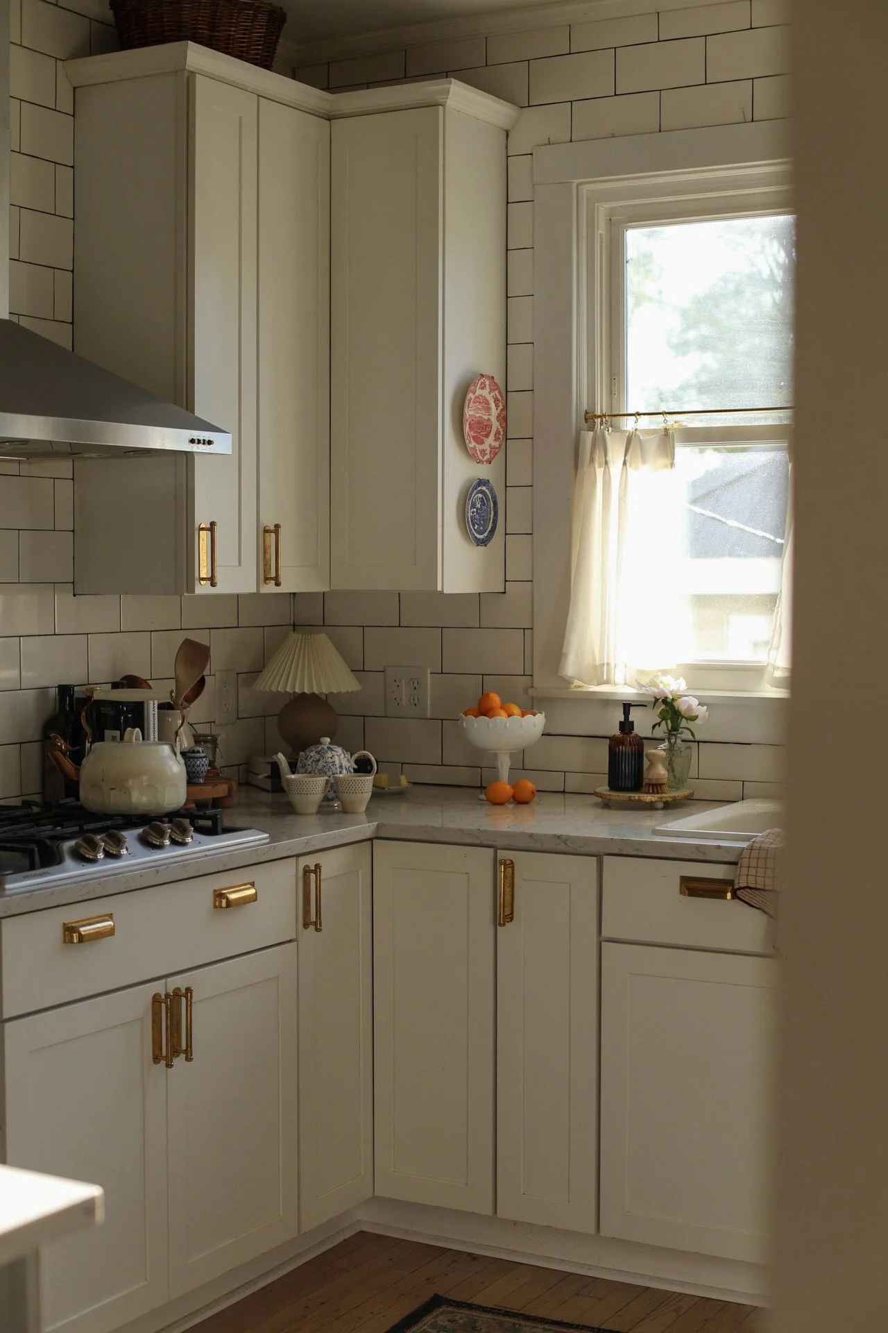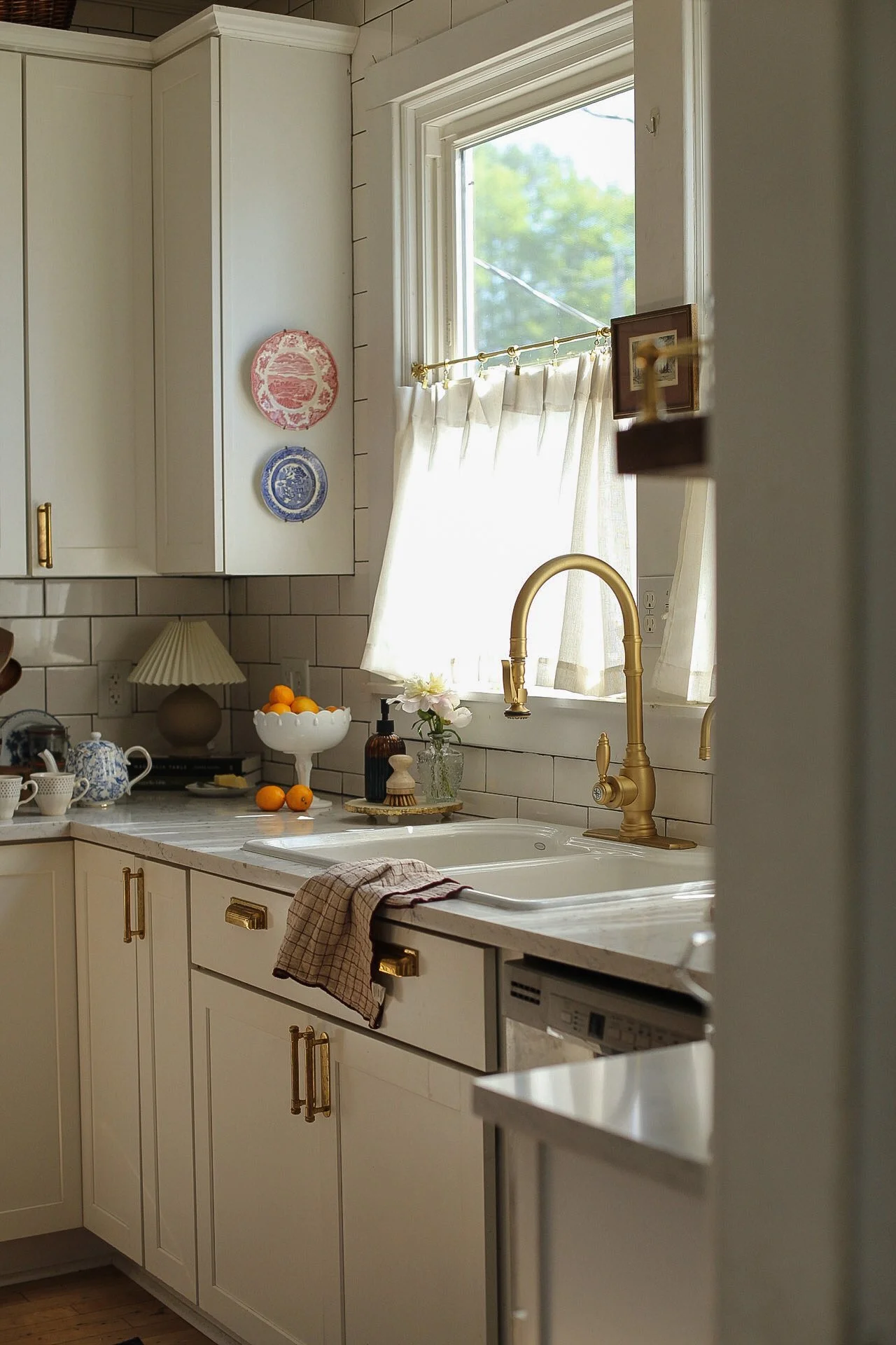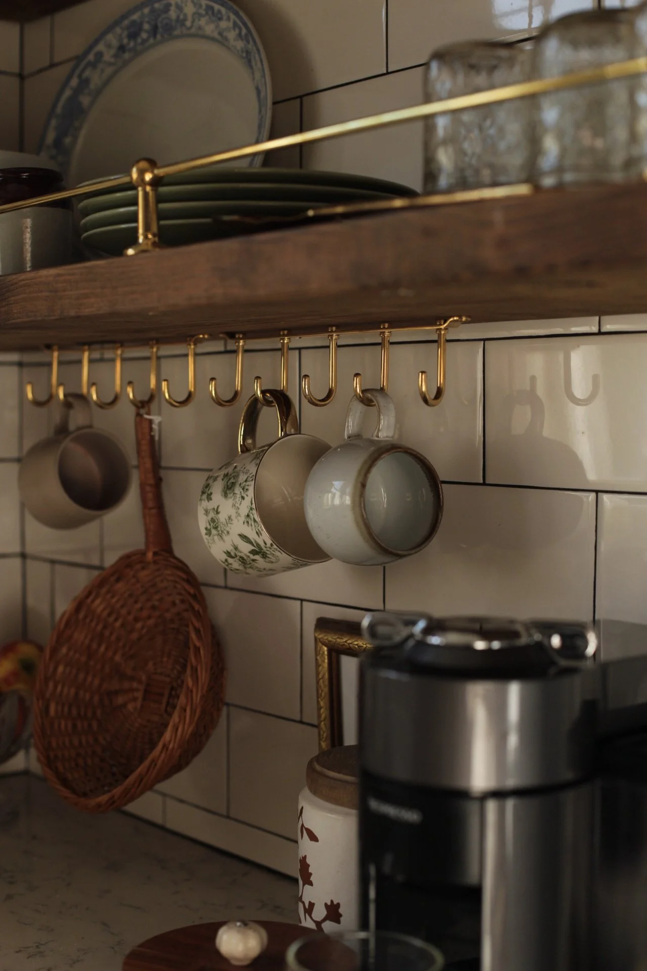 Our kitchen may be just 10x10, but it proves that small spaces can be both beautiful and hardworking. Designed with intention, every detail—from the layered lighting and unlacquered brass hardware to the gallery rail and vintage-inspired fixtures—was chosen to maximize function without sacrificing character. The compact layout makes gathering, cooking, and everyday living feel warm and connected, turning this modest kitchen into the true heart of our 1920s Craftsman home.