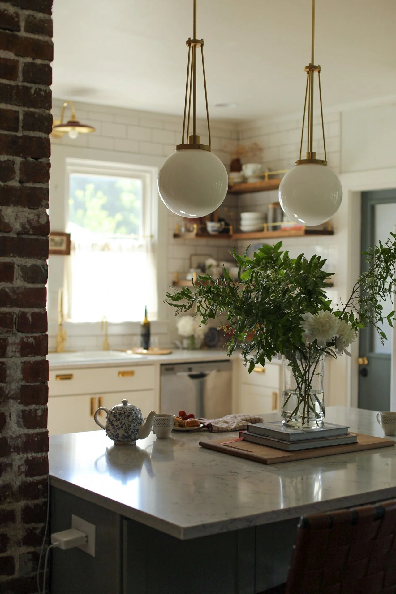 Cabinet Pulls // Unlacquered Brass | Kitchen Faucet // Matte Black | Pendant Lights // Vintage Brass