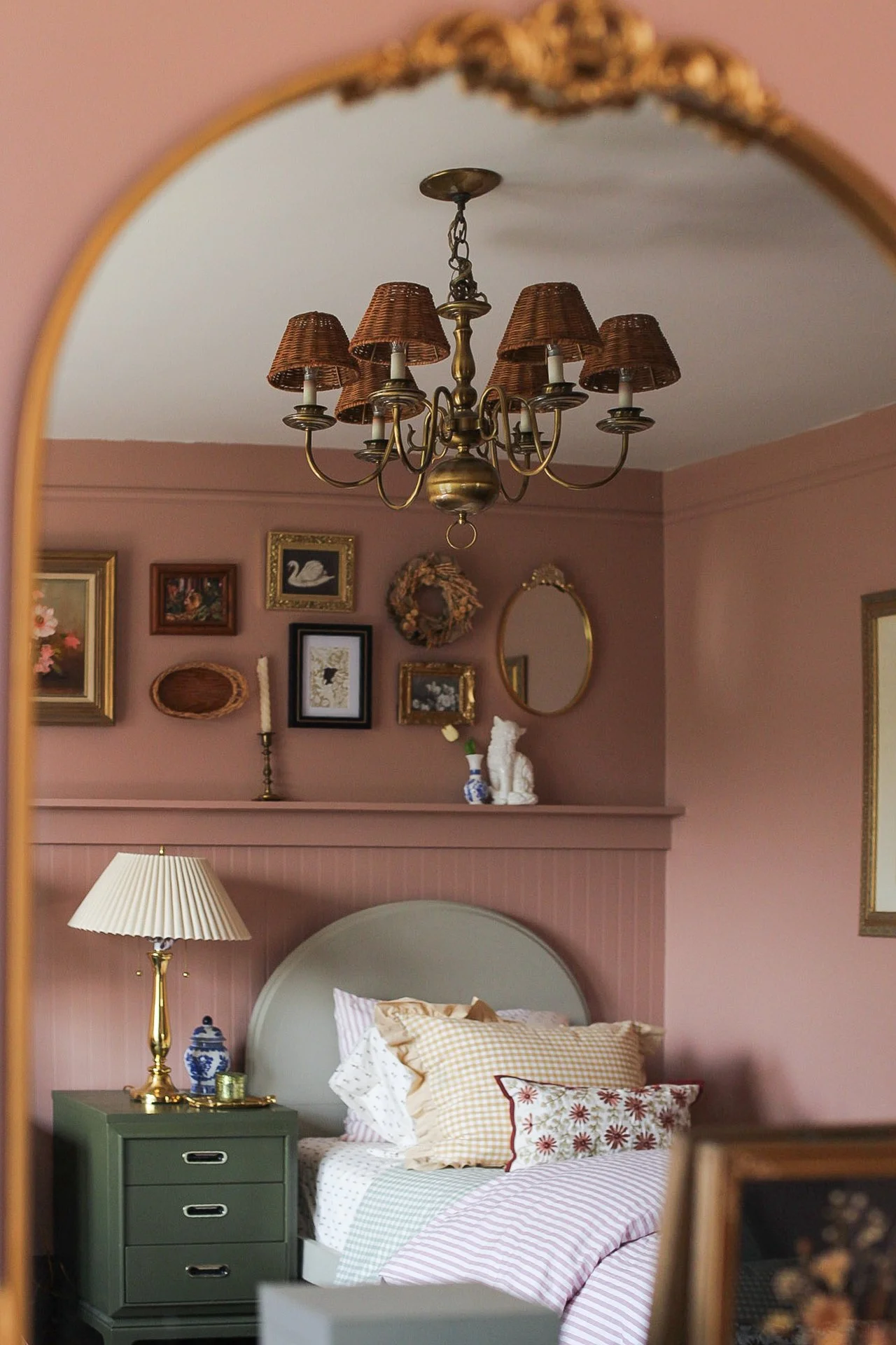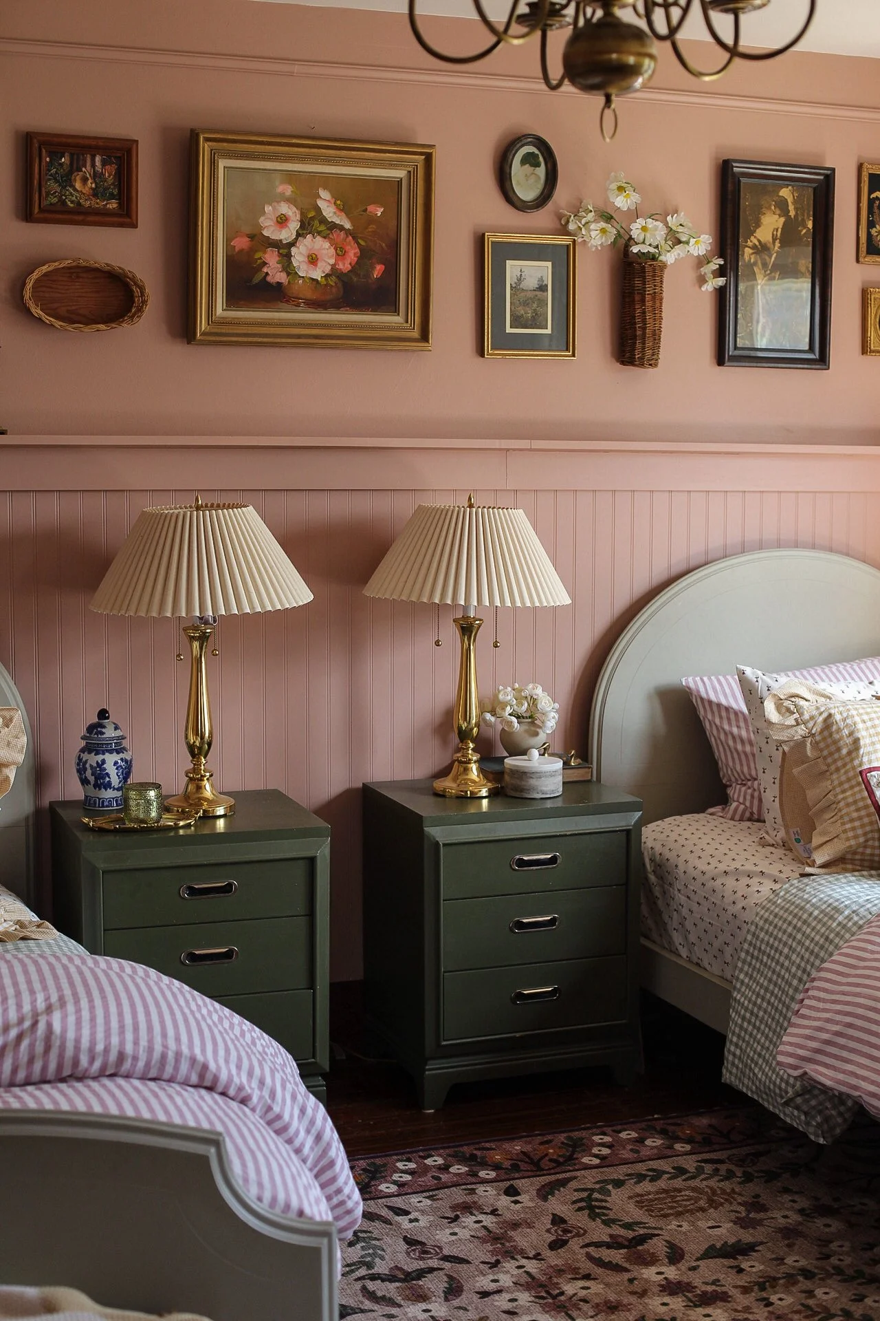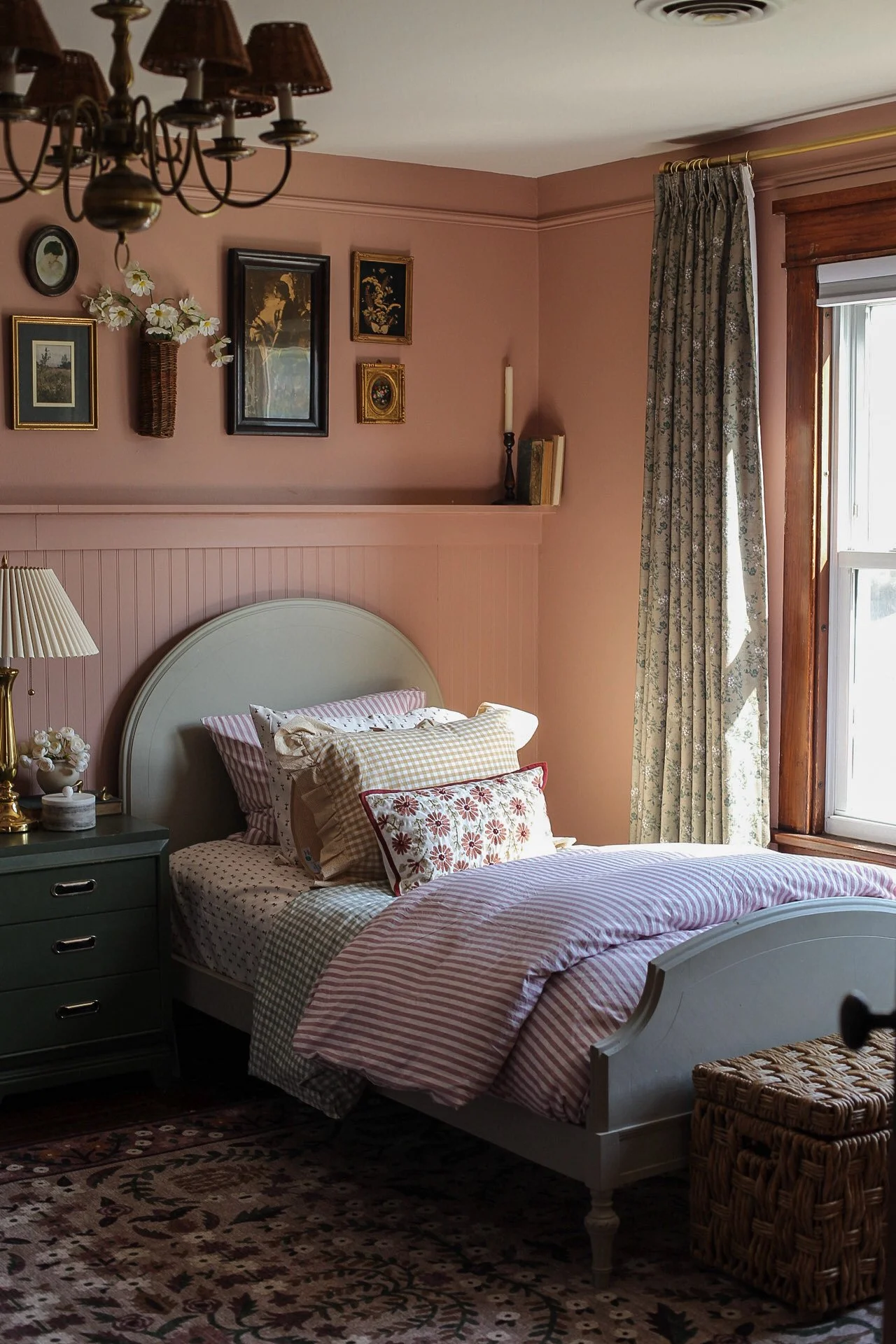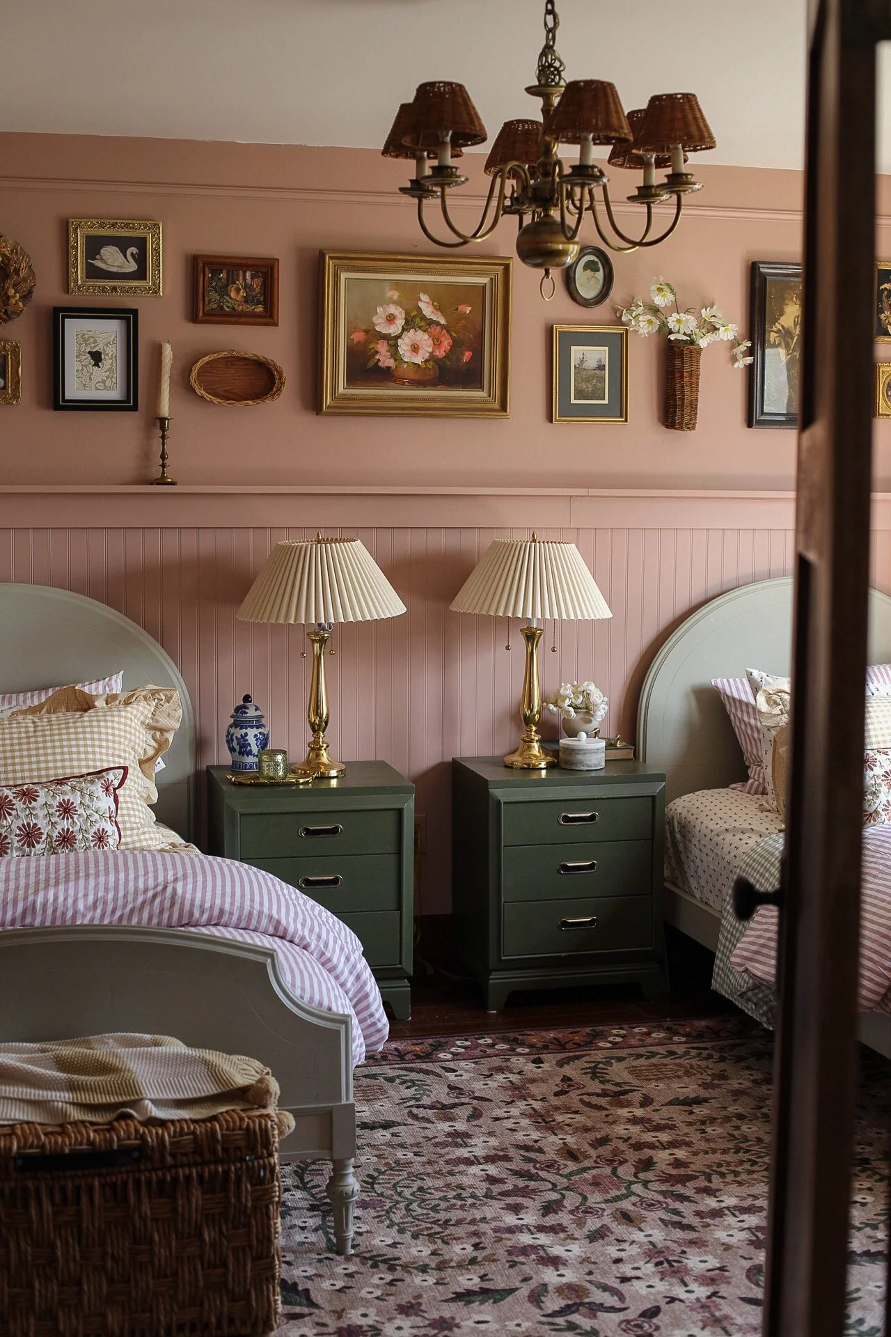 Named for its instantly lovable blush-toned walls, The Pink Room is inspired by vintage palettes of days gone by and brims with character through thoughtful details like its arched twin headboard and picture molding. The space invites a collected, heirloom-like ambiance with carefully chosen thrifted finds, from the softly hued bedding and pleated-shade table lamp to gallery-style wall art and woven accents that balance warmth with whimsy.