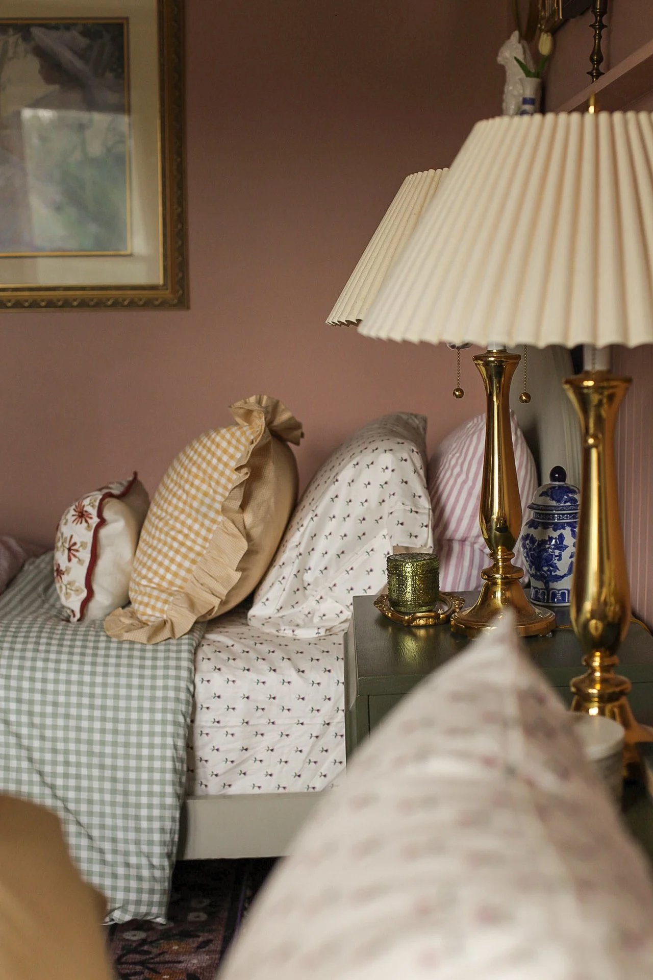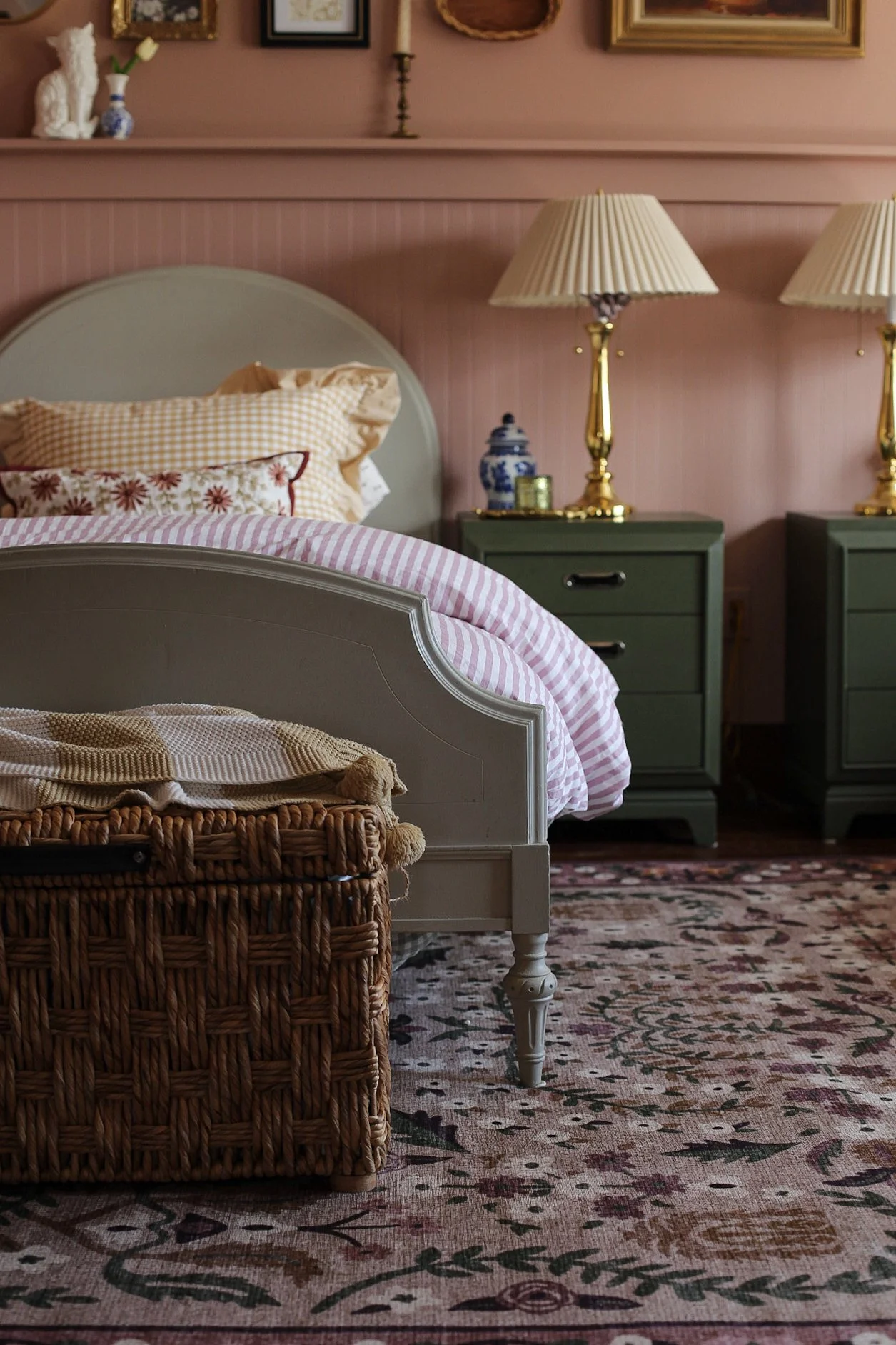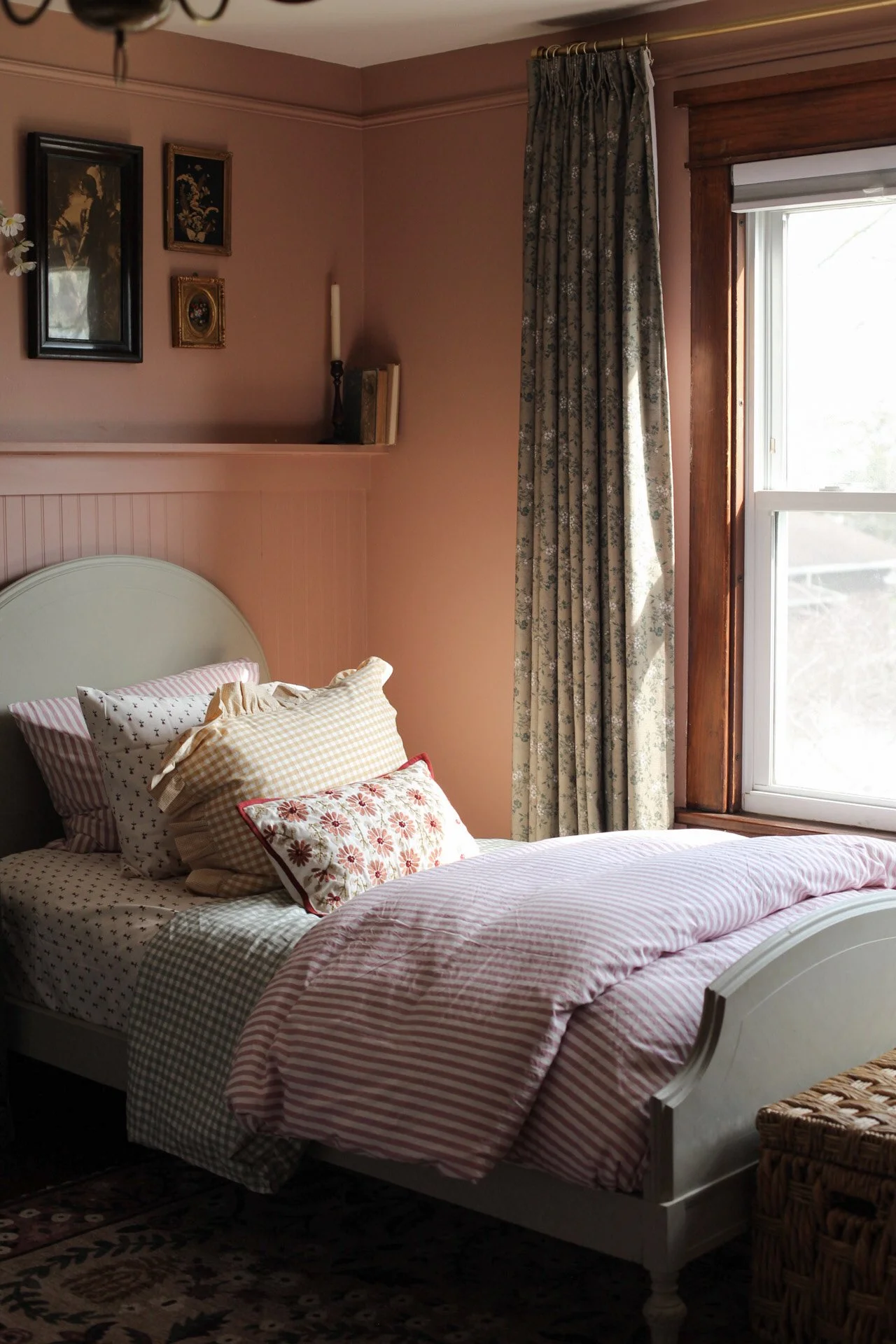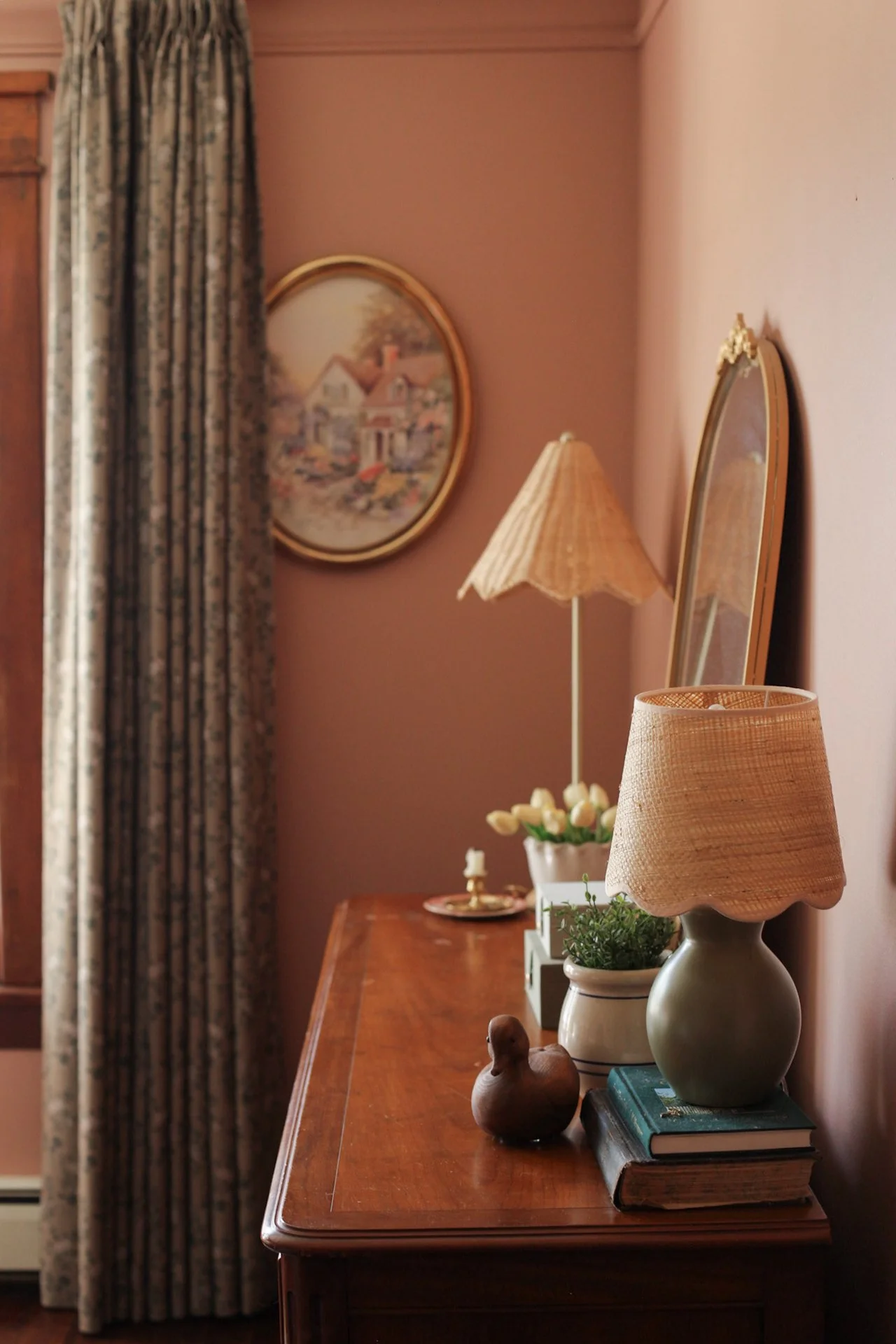Named for its instantly lovable blush-toned walls, The Pink Room is inspired by vintage palettes of days gone by and brims with character through thoughtful details like its arched twin headboard and picture molding. The space invites a collected, heirloom-like ambiance with carefully chosen thrifted finds, from the softly hued bedding and pleated-shade table lamp to gallery-style wall art and woven accents that balance warmth with whimsy.