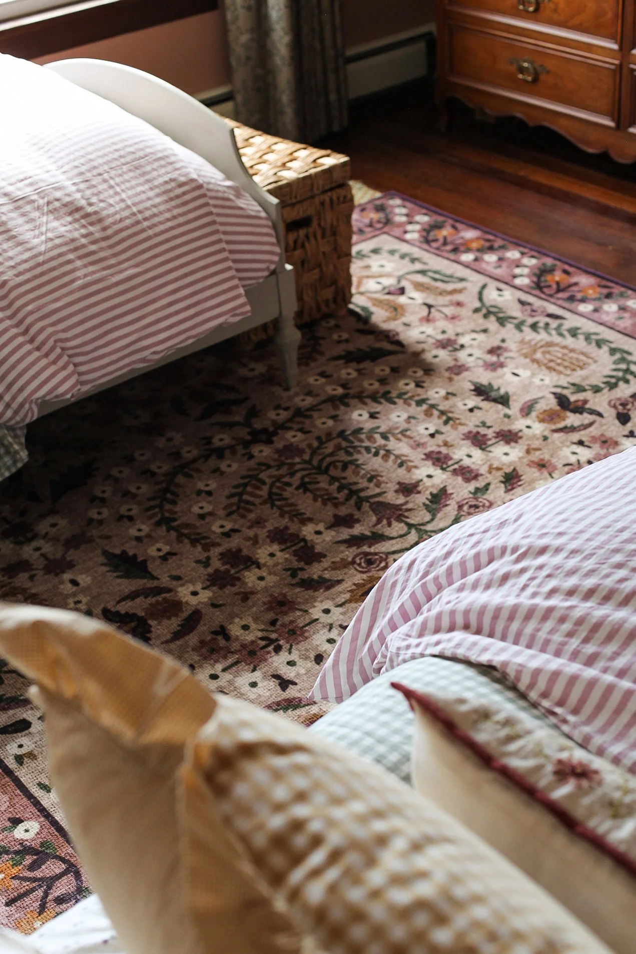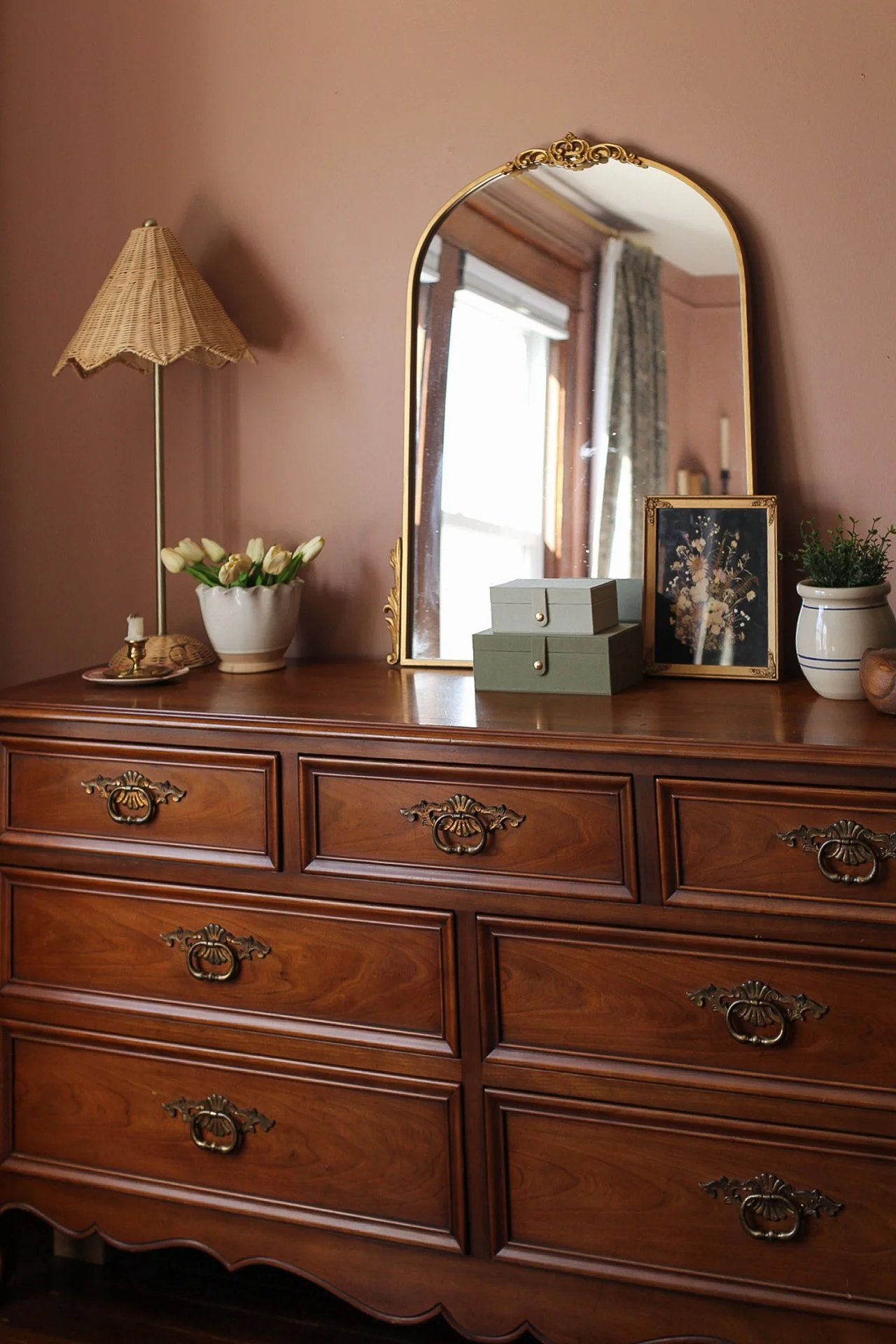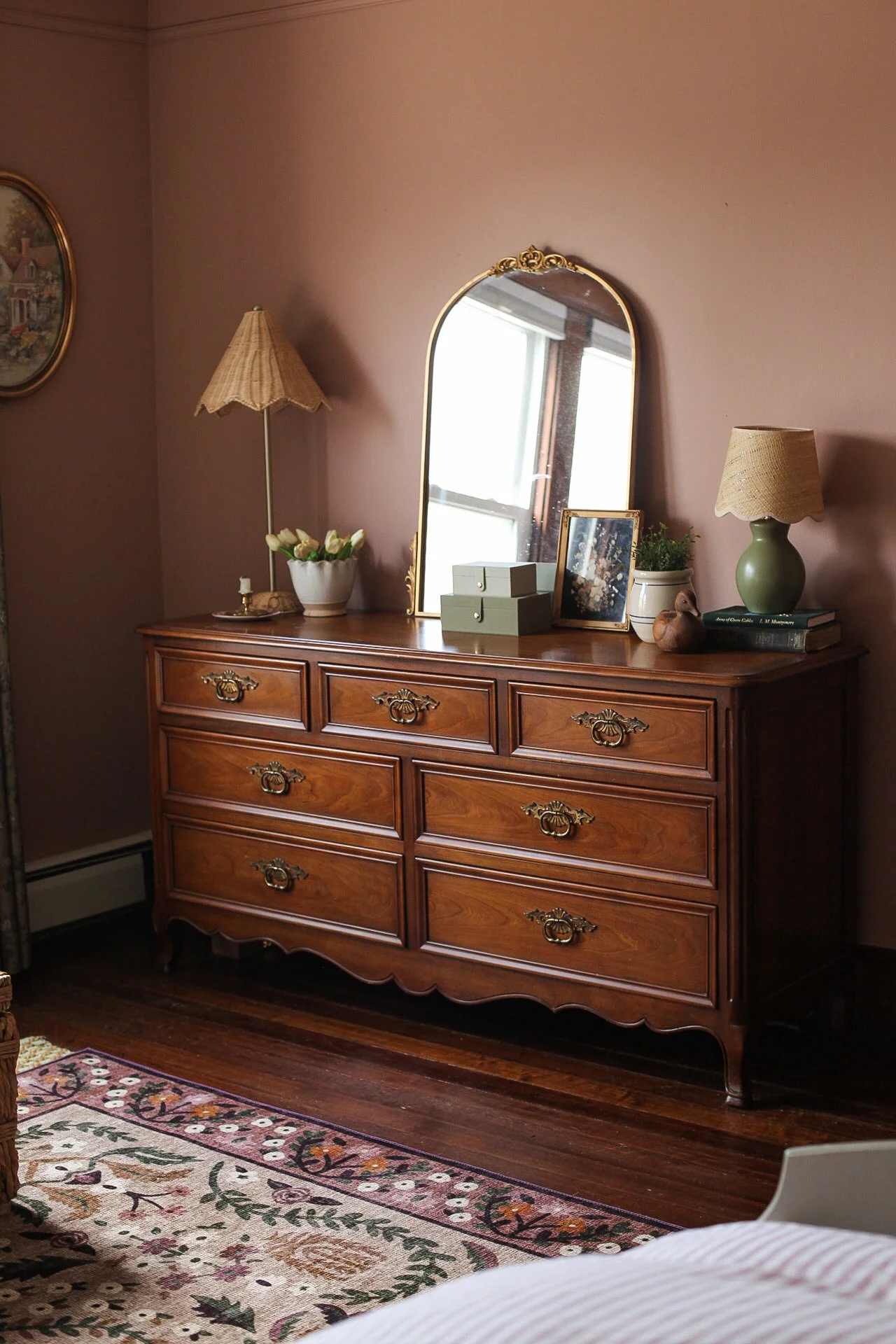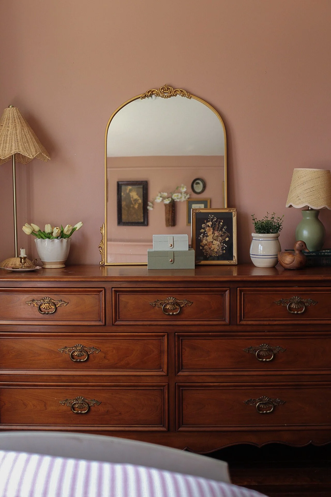 Named for its instantly lovable blush-toned walls, The Pink Room is inspired by vintage palettes of days gone by and brims with character through thoughtful details like its arched twin headboard and picture molding. The space invites a collected, heirloom-like ambiance with carefully chosen thrifted finds, from the softly hued bedding and pleated-shade table lamp to gallery-style wall art and woven accents that balance warmth with whimsy.