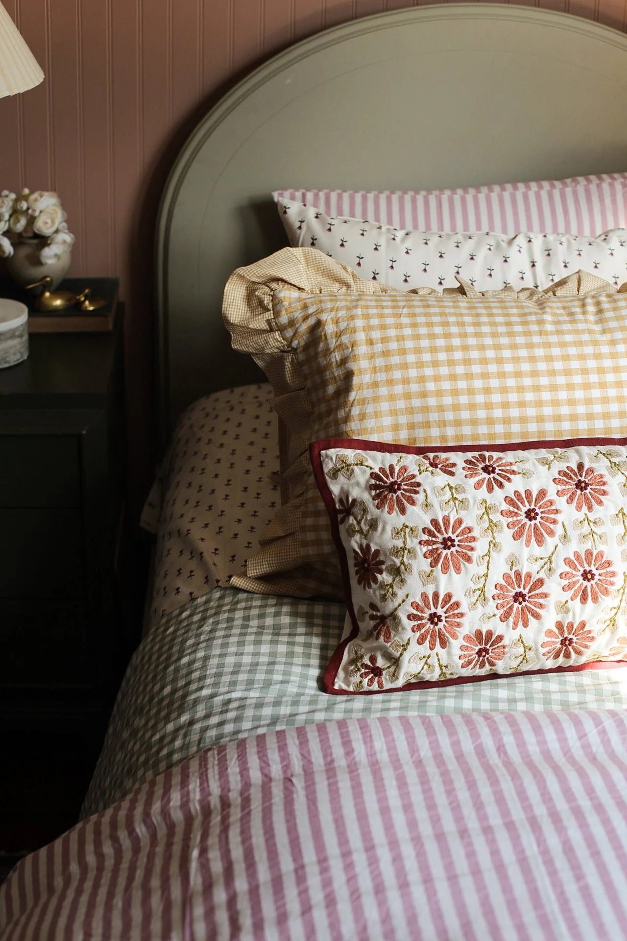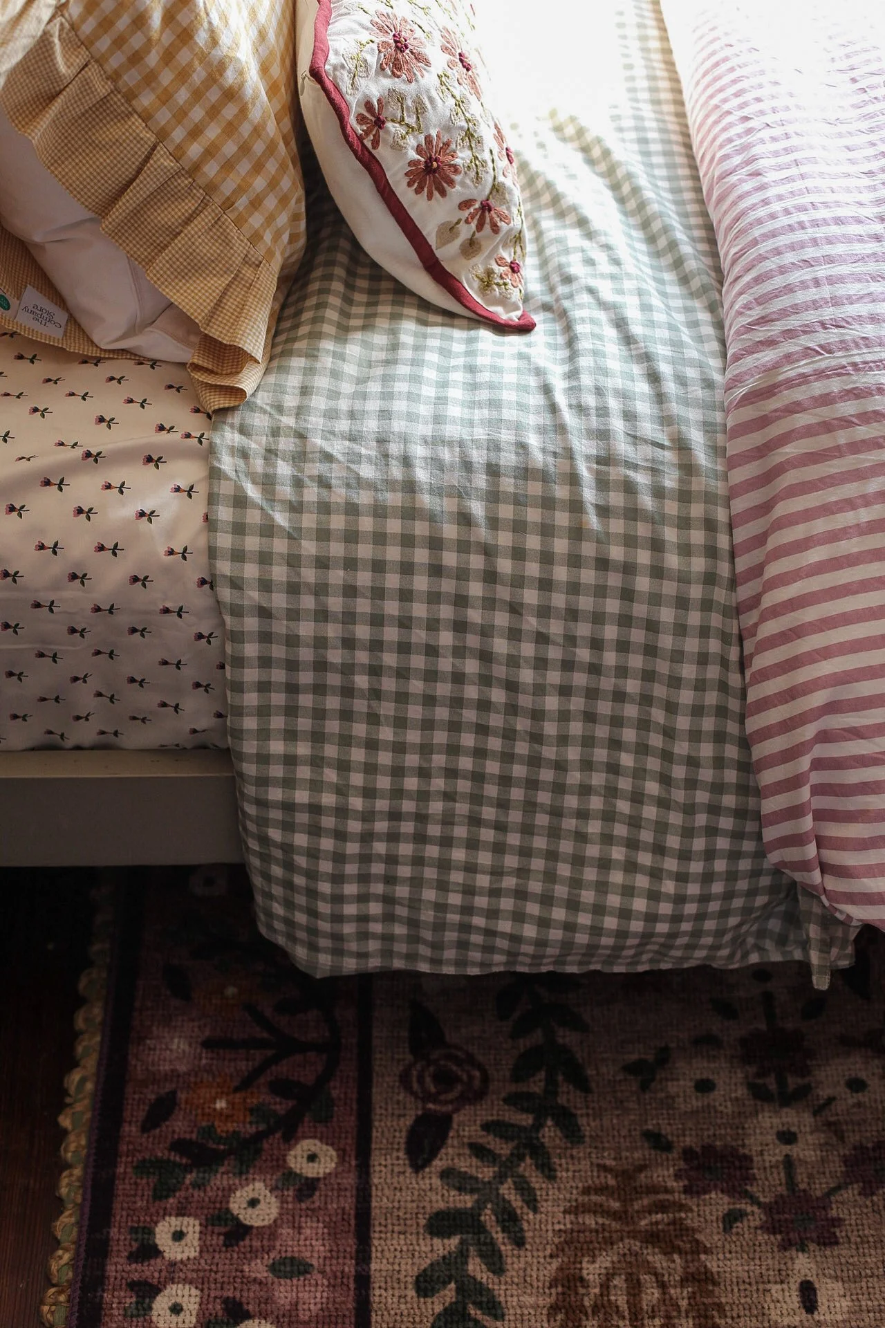 Duvet Cover (green gingham) | Duvet Cover (pink striped) Comforter | Yellow Gingham Sham | Embroidered Pillow | Floral Sheet Set